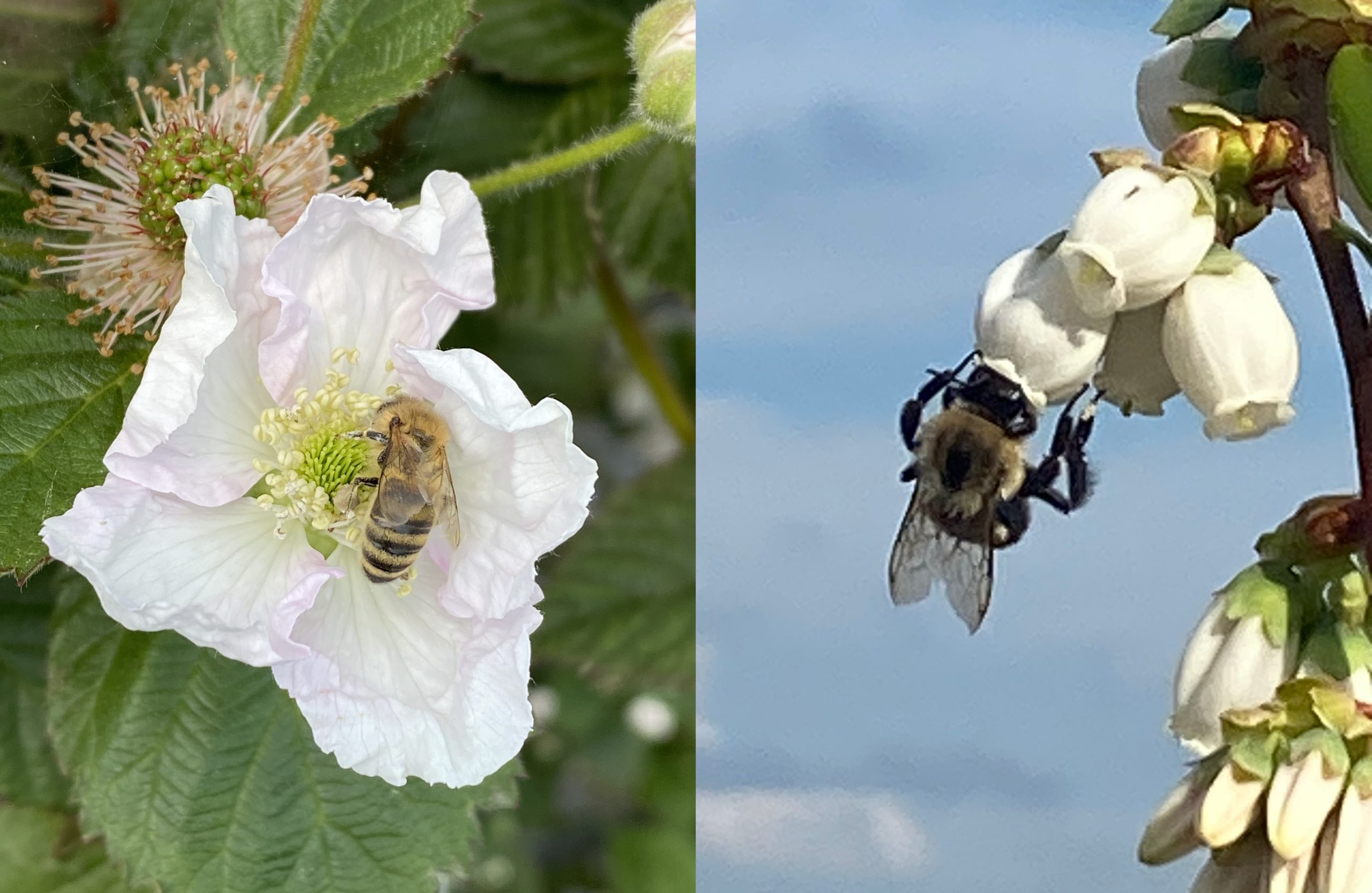 Commercially reared and managed bees busy “bee vectoring” on crop fields with the BVT system in use; Left: a honey bee on a raspberry bloom in California; Right: a bumble bee on a blueberry bloom in Georgia.