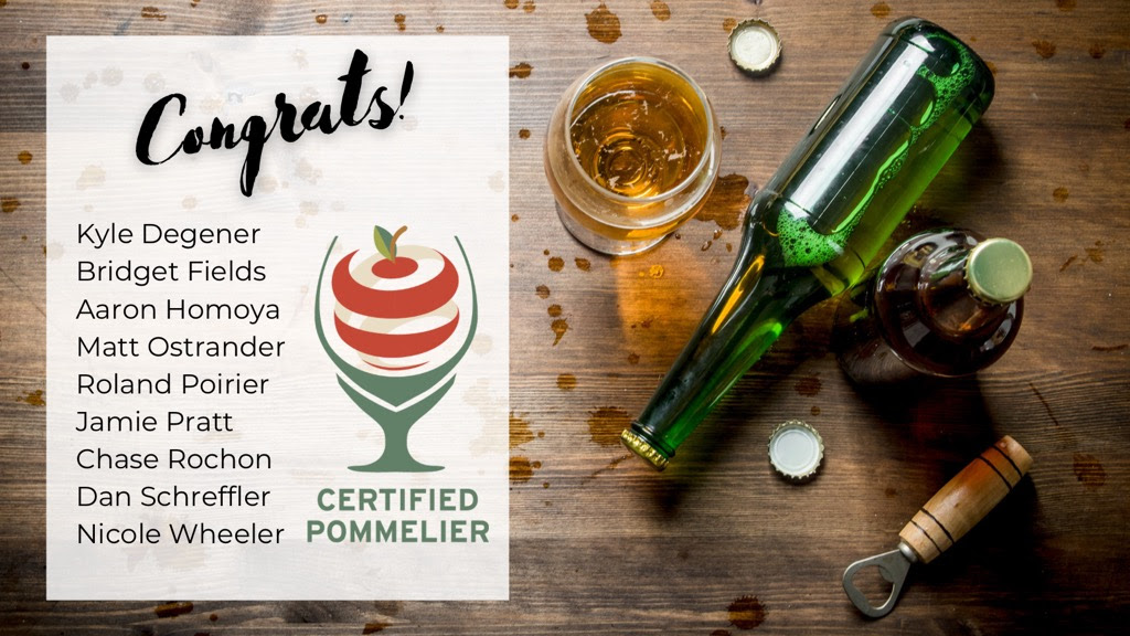 Newly Certified Pommeliers are: Matthew Ostrander of Ibantik Craft Beverages (Utah), Dan Schreffler of Space Time Mead and Cider Works (Pennsylvania), Chase Rochon of Craft Curbside (Maine), Jamie Pratt of Liberty Ciderworks (Washington), Nicole Wheeler of Treehorn Cider (Georgia), Aaron Homoya of Ash & Elm Cider Co (Indiana), orchardists Kyle Degener (Holy Beez Orchard, Kentucky) and Roland Poirier (New York), and cider aficionado Bridget Fields (Washington, D.C.).