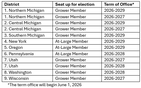 Nomination forms were emailed to growers on Oct. 23. Nominations are due back to the CIAB no later than 5 p.m. EST on Nov. 6, 2025.