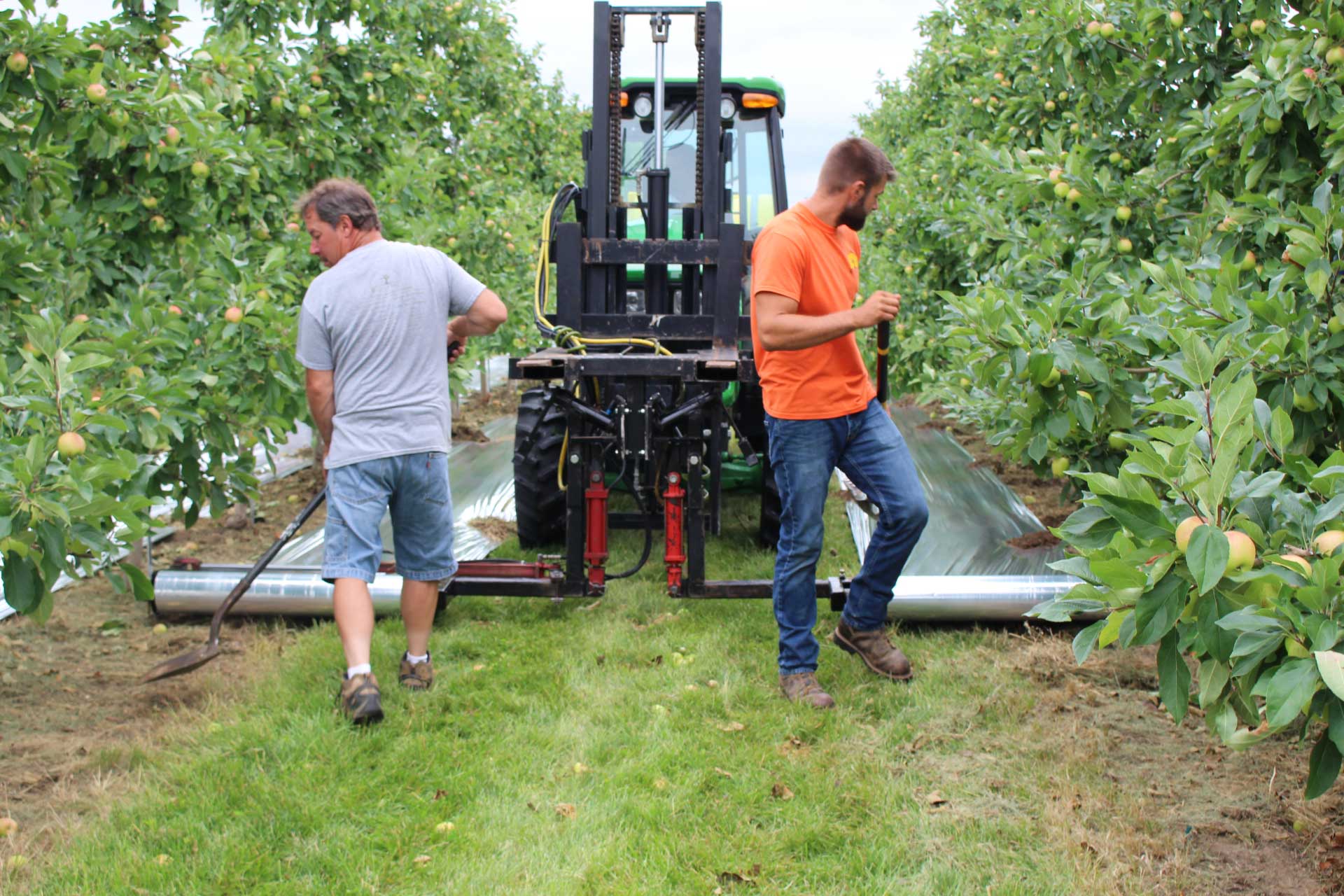 Root pruning and scoring are two of the most extreme yet essential tools the farm has embraced over the decades to keep vigorous and biennial varieties in check. Some years, half of the farm has bene root pruned. Kyle, Devin and Eric, the next generation at Tom Rasch & Son Orchards, continue to tweak and experiment with the systems in place and have influenced many big limbs to be removed. Kyle Rasch displayed the use of reflector foil as a between-row groundcover to enhance sun accessibility in the tree canopy.