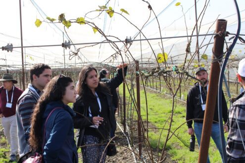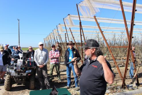 The day’s fourth stop was perhaps its most intriguing, as the group walked The Grapery’s low-chill, high-density trellised upright fruiting offshoots (UFO) experimental cherry plots.