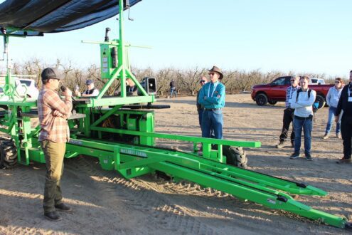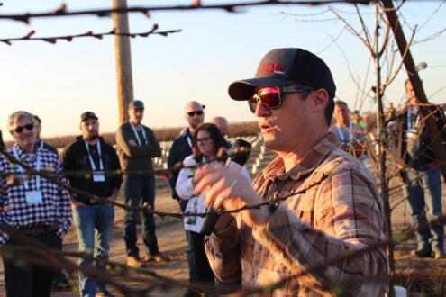 To close out the day, the group swung by HMC Farms on the way back to Fresno to hear from growers Jon McLarty (pictured above left) and Drew Ketelson on the farm’s high density, narrow training system and how it’s allowed them to be more efficient in both thinning and harvesting 6,000 acres of stone fruit.