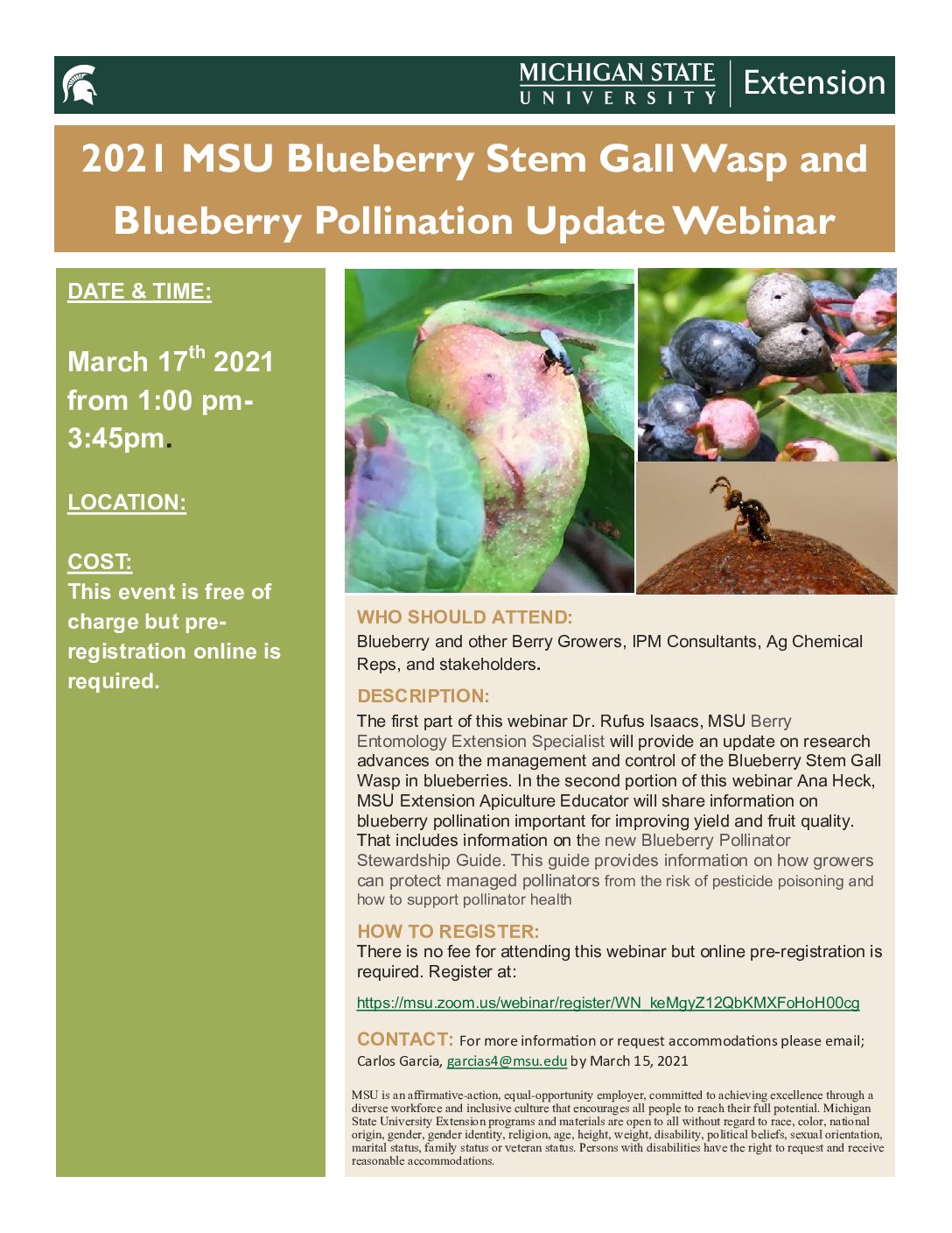According to Carlos Garcia Salazar, small fruit educator, MSU Extension Agriculture and Agribusiness Institute, during the first part of this webinar, Rufus Isaacs, MSU berry entomology Extension specialist, will provide an update on research and Extensi