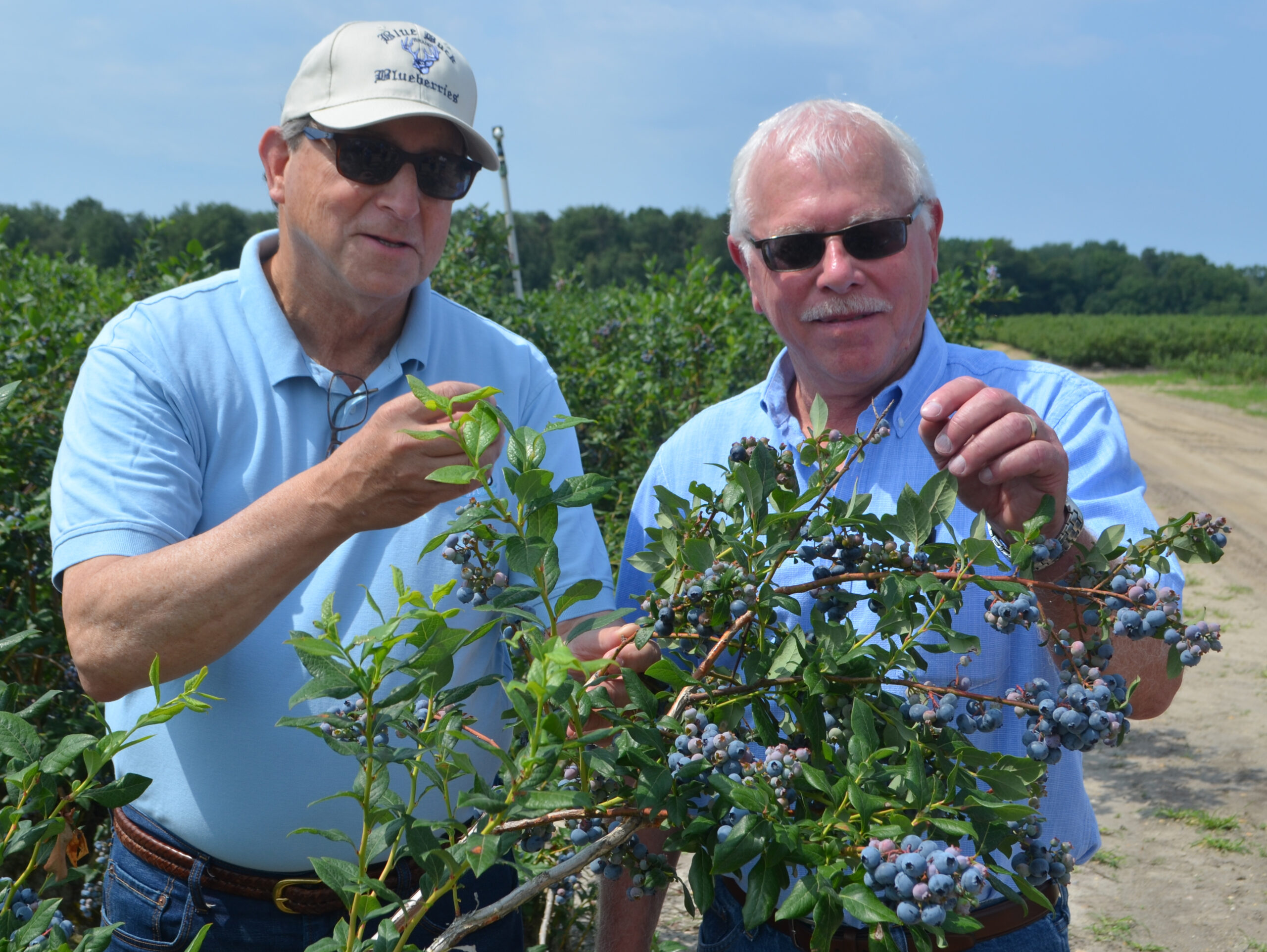 Photo: New Jersey Secretary of Agriculture Douglas H. Fisher, left, and Paul Macrie checking out the blueberries in one of the fields at the Macrie Brothers Blueberry Farm on July 12.