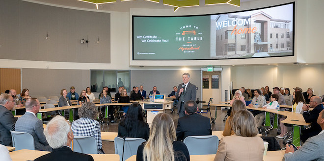 — Stacy Nick, Colorado State University; Photo at top: One of the many highlights of the new Nutrien Agricultural Sciences Building is the Bernard Rollin Knowledge Well. Dean James Pritchett shows attendees of the building’s grand opening how the in-the-round classroom provides for better student engagement. Photos by Joe Mendoza, CSU Photography.