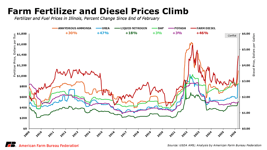 “Since the escalation in the Middle East, nitrogen fertilizer prices have risen more than 30%, while combined fuel and fertilizer costs have increased roughly 20% to 40%,” the Market Intel report states. “Prices have increased by 47% since the end of February, marking the largest month-to-month percentage increase in the price of urea.”